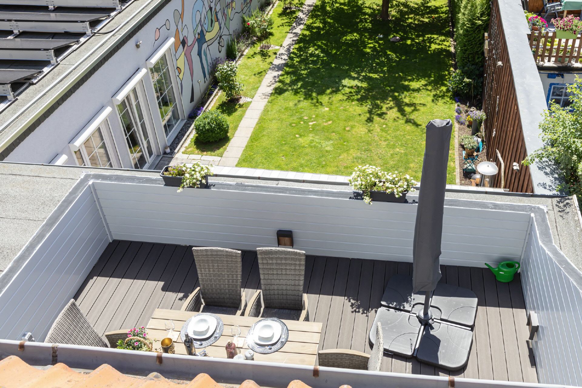Ein Highlight dieses Appartements ist die sonnige, großzügige, ca 20 qm große Dachterrasse mit Blick in den Garten und über Teile der Altstadt.